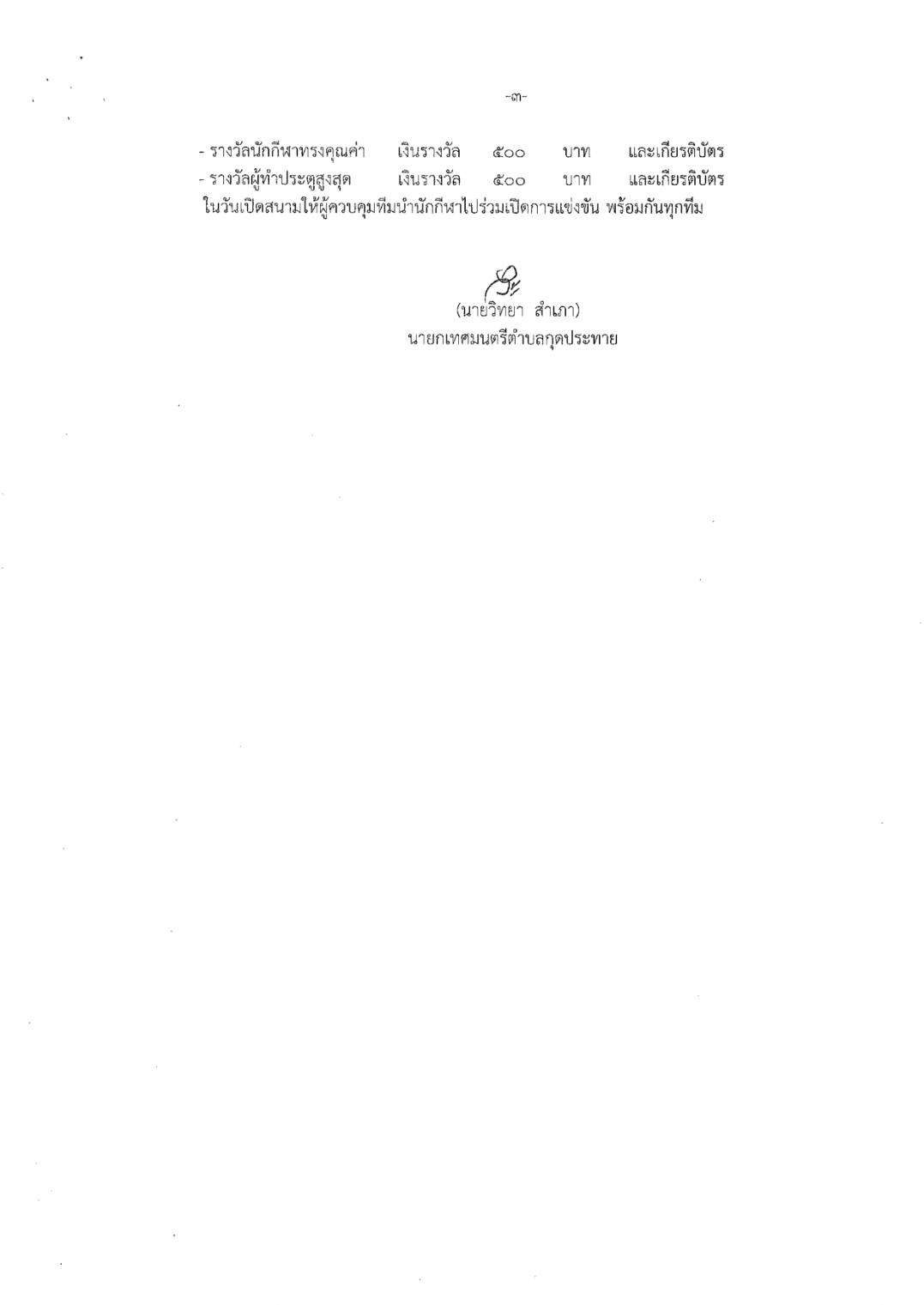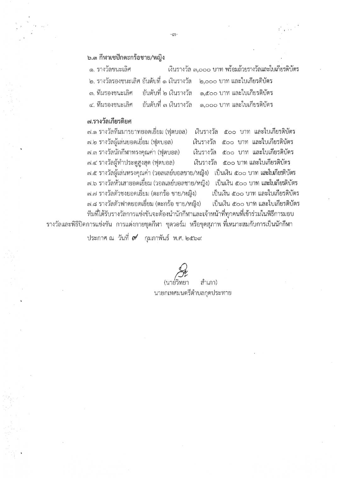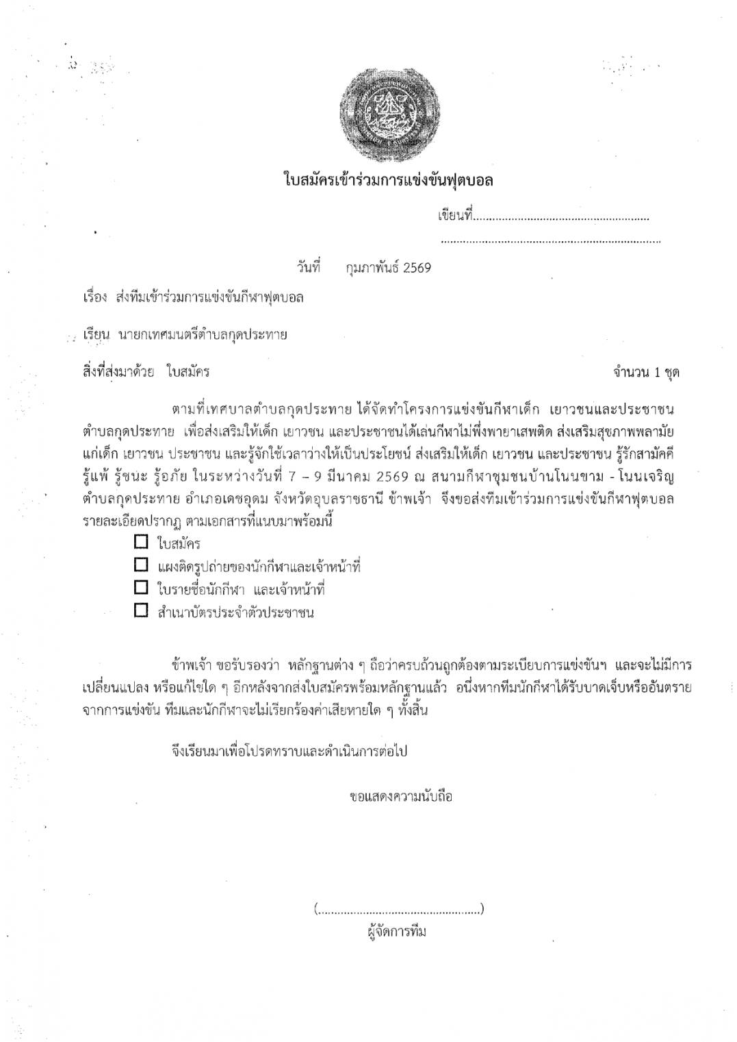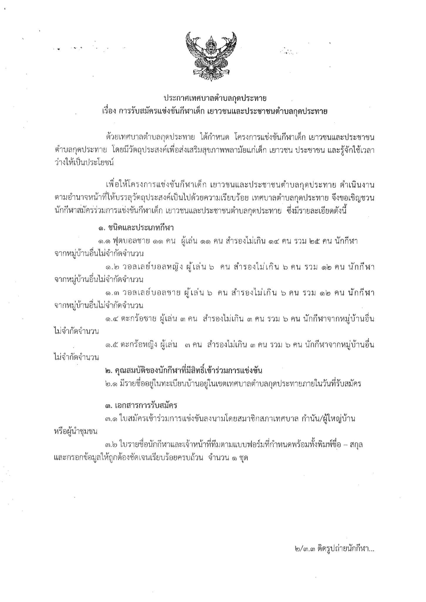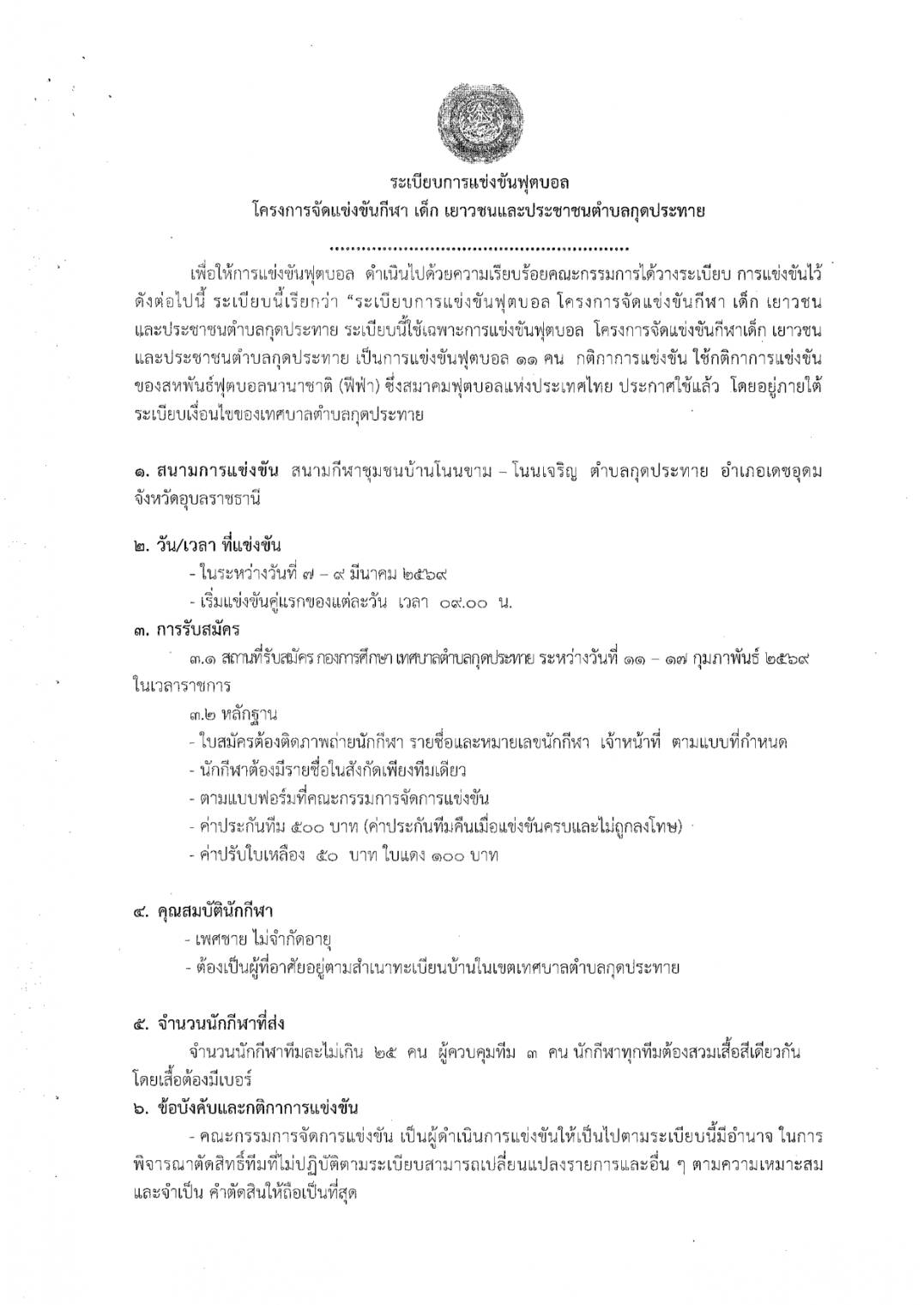 ประกาศเทศบาลตำบลกุดประทาย เรื่อง การรับสมัครแข่งขันกีฬาเด็ก เยาวชนและประชาชนตำบลกุดประทาย ประจำปี 2569 รับสมัครตั้งแต่วันที่ 11 - 17 กุมภาพันธ์ 2569 ในวันเวลาราชการ ณ กองการศึกษา เทศบาลตำบลกุดประทาย