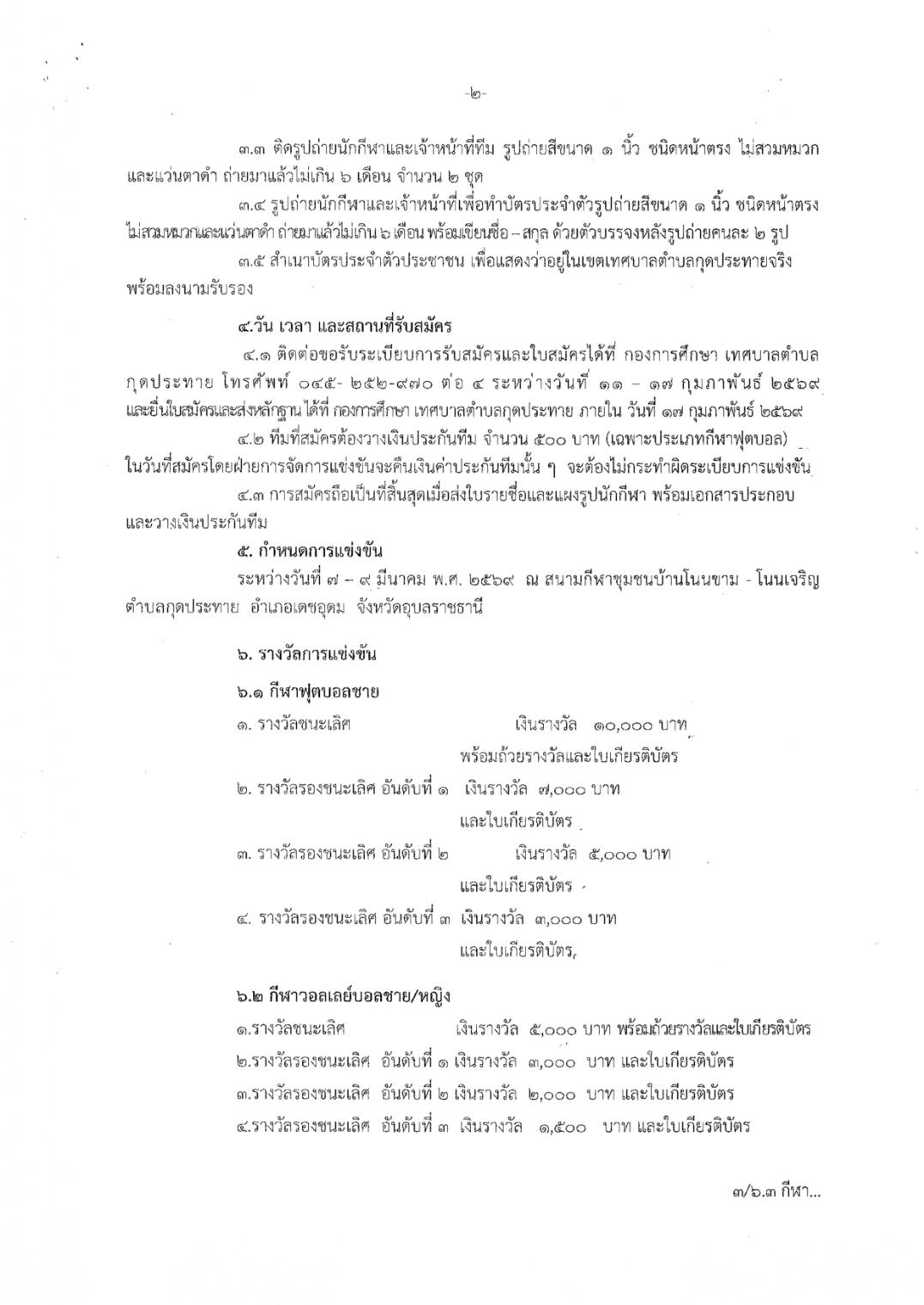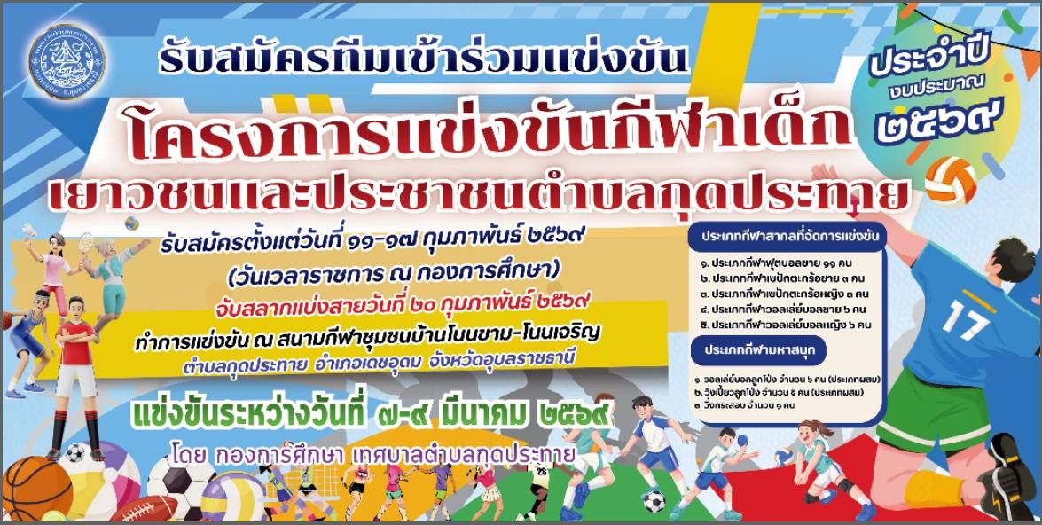 ประกาศเทศบาลตำบลกุดประทาย เรื่อง การรับสมัครแข่งขันกีฬาเด็ก เยาวชนและประชาชนตำบลกุดประทาย ประจำปี 2569 รับสมัครตั้งแต่วันที่ 11 - 17 กุมภาพันธ์ 2569 ในวันเวลาราชการ ณ กองการศึกษา เทศบาลตำบลกุดประทาย